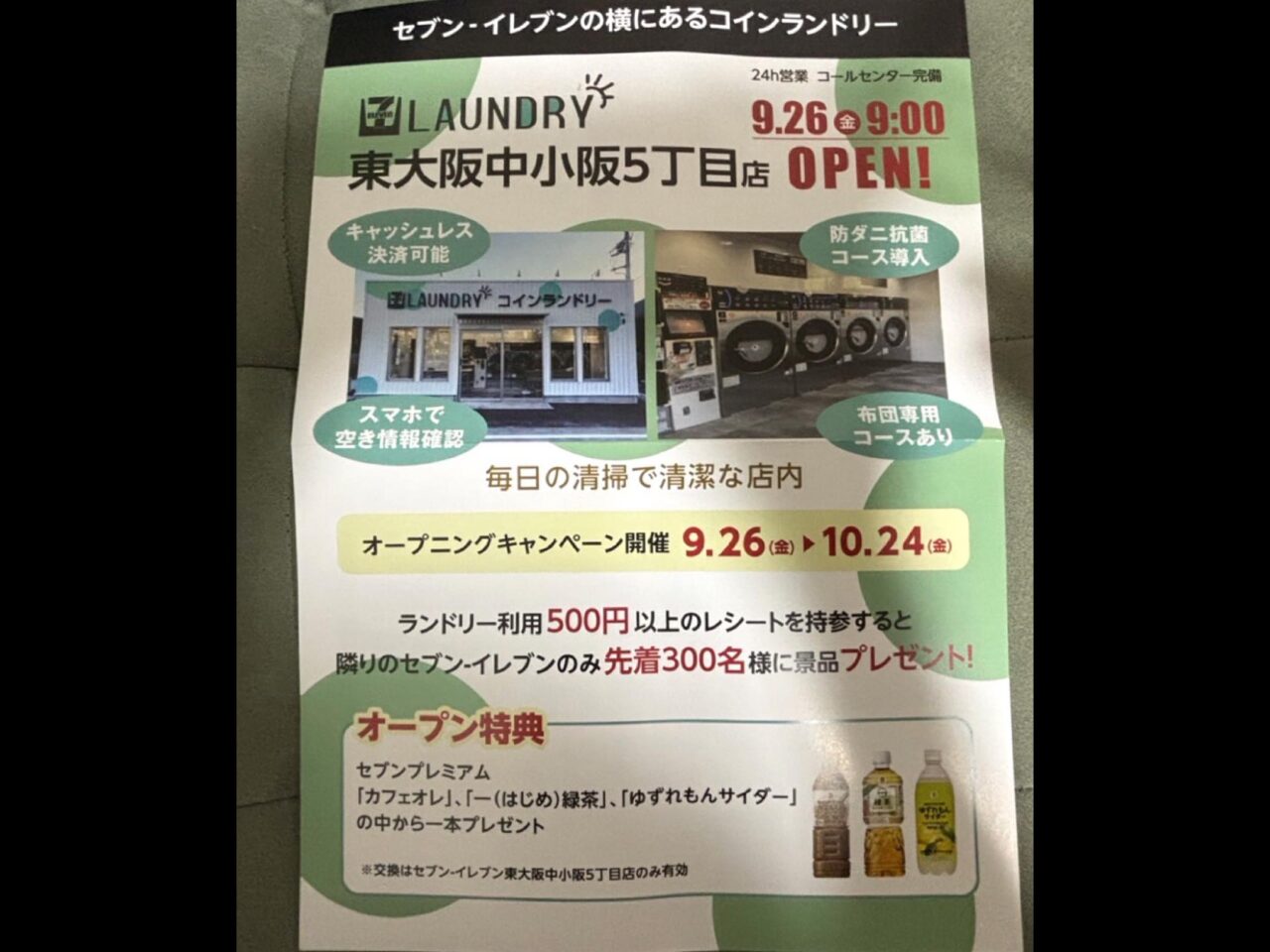『コインランドリー 東大阪中小阪5丁目店』のチラシによると、オープン日は明日2025年9月26日(金)9時00分!