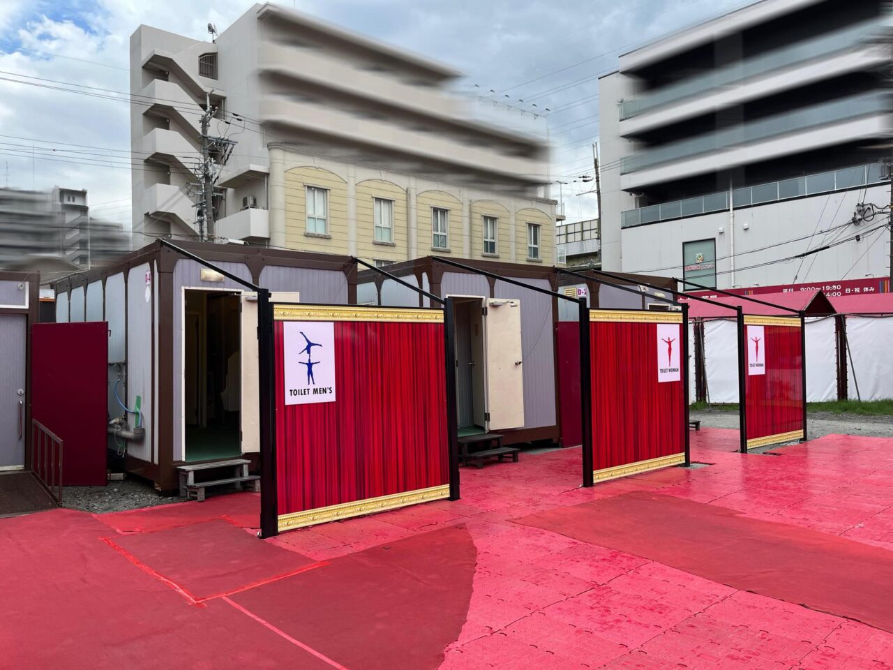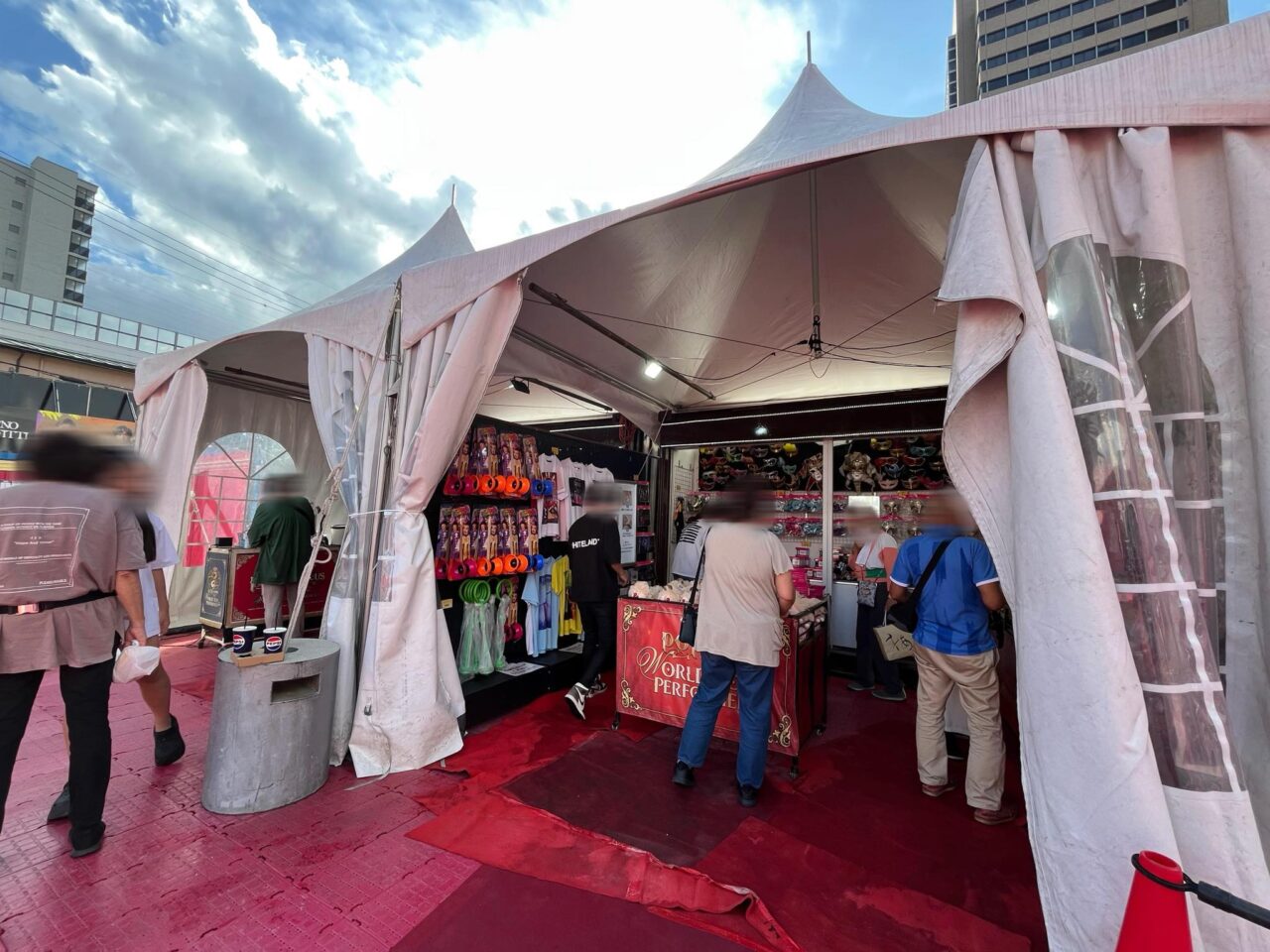 入場口を進むと、食べ物を販売する売店やグッズ売り場、フォトスペース、トイレなど沢山のテントが立っています。