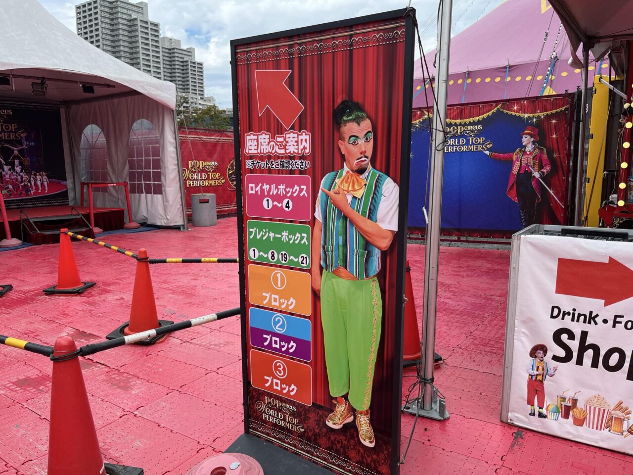 サーカスというと夜に開催されているイメージでしたが、お昼でも赤い看板が良く映えており気分が上がります。