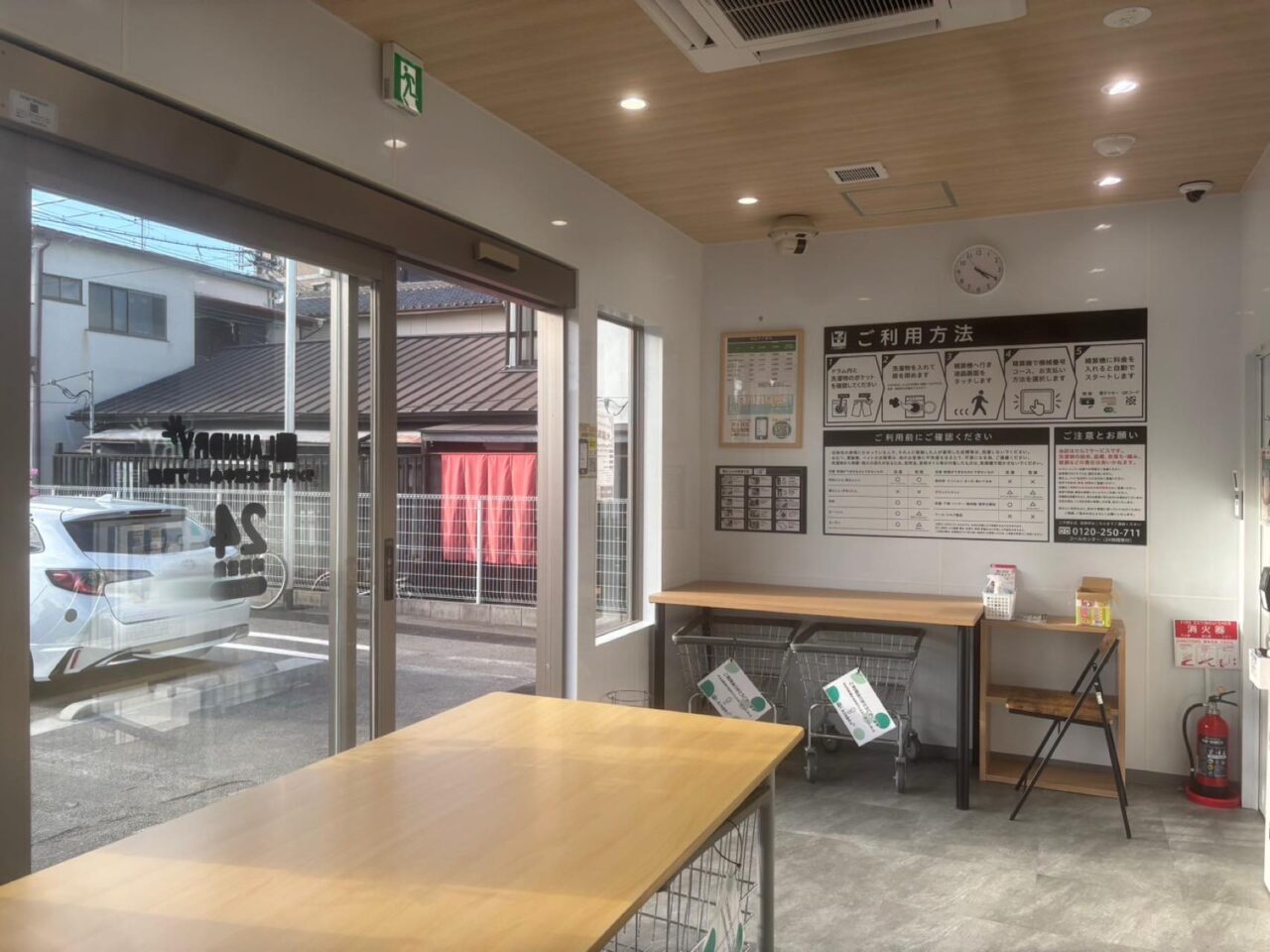 店内には、4台の業務用洗濯乾燥機、机やカート、利用方法、料金案内などが書かれた説明書などが設置されていました。