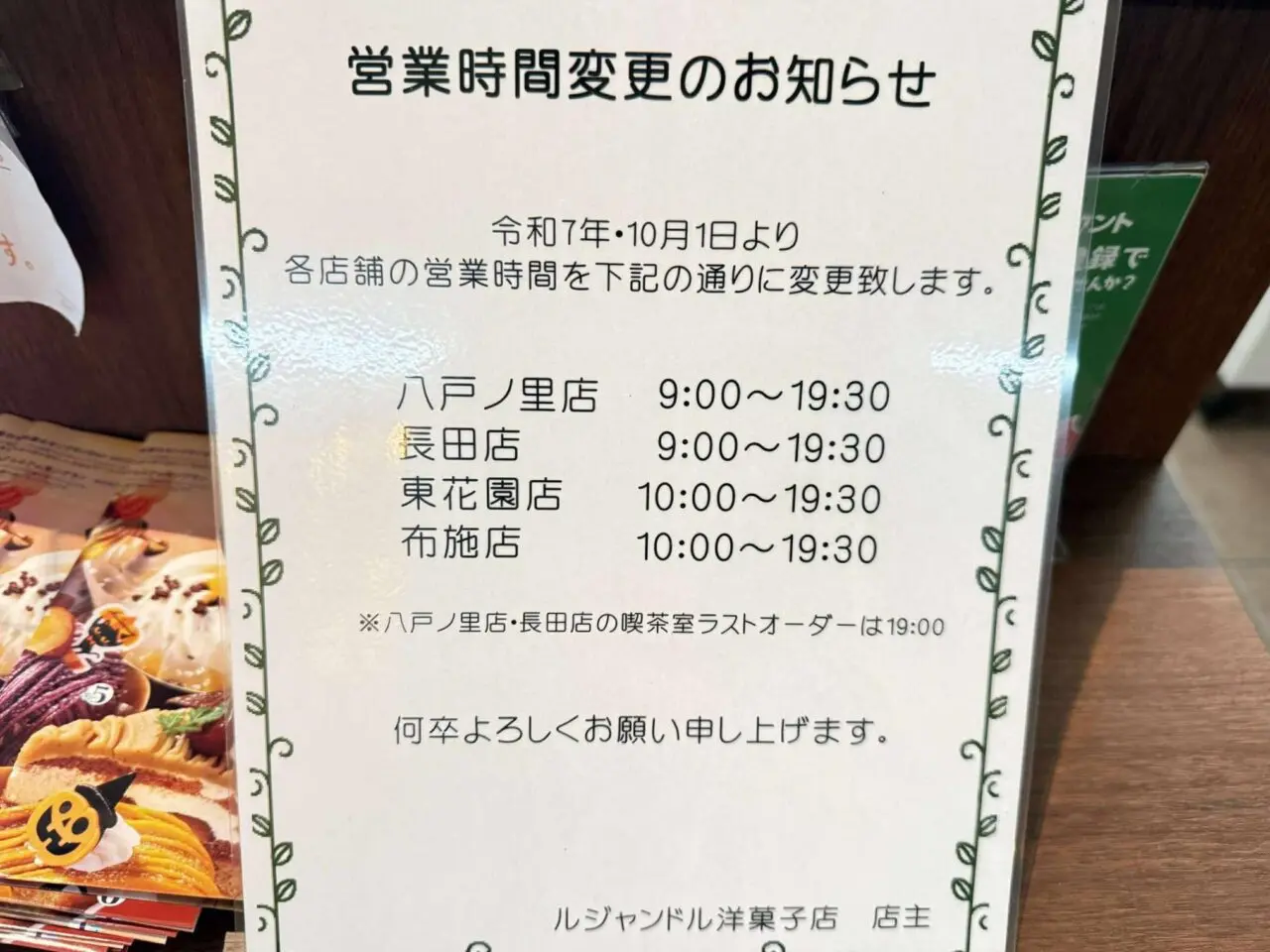 『ルジャンドル』の営業時間変更を知ったのは2025年10月上旬。『ルジャンドル 長田店』でのお会計時に貼紙を発見しました。