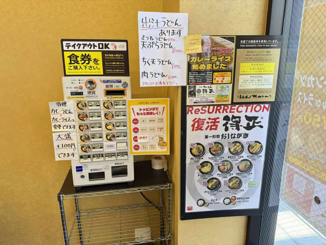 『カレーうどん得正 若江岩田駅前店』へ訪れたのは、2025年11月下旬。お店前には看板が設置されており、入る前にメニューを確認できます。