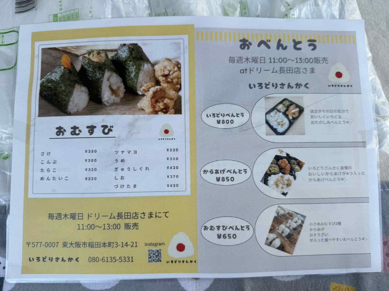 東大阪市稲田本町にある、おむすび屋『いろどりさんかく』が、店舗以外でも出張販売をしていると聞き、行ってきました。