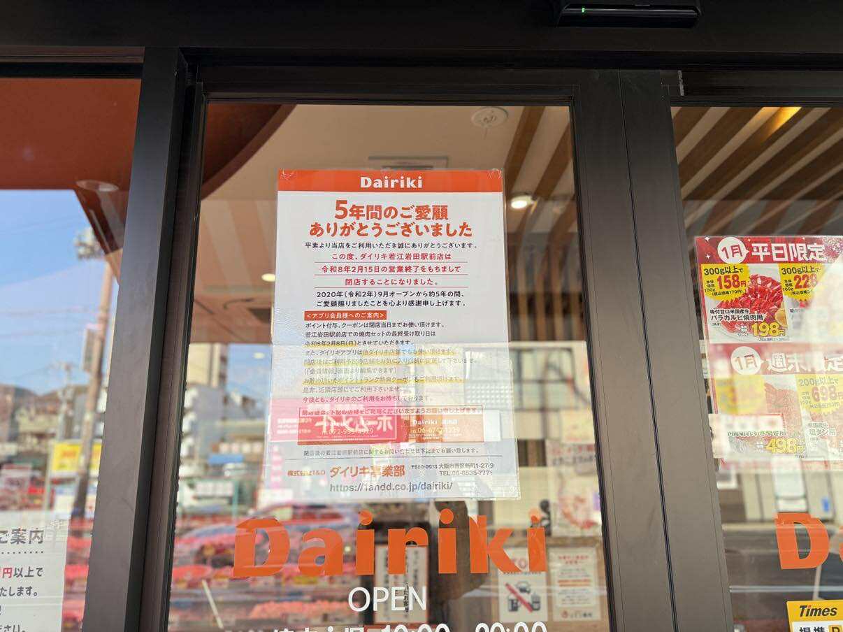 【東大阪市】オープンから5年間営業を続けていた『ダイリキ 若江岩田駅前店』が2026年2月に閉店します。