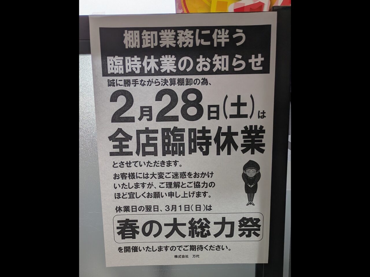 『万代』の一斉休業日となるのは、2026年2月28日(土)。