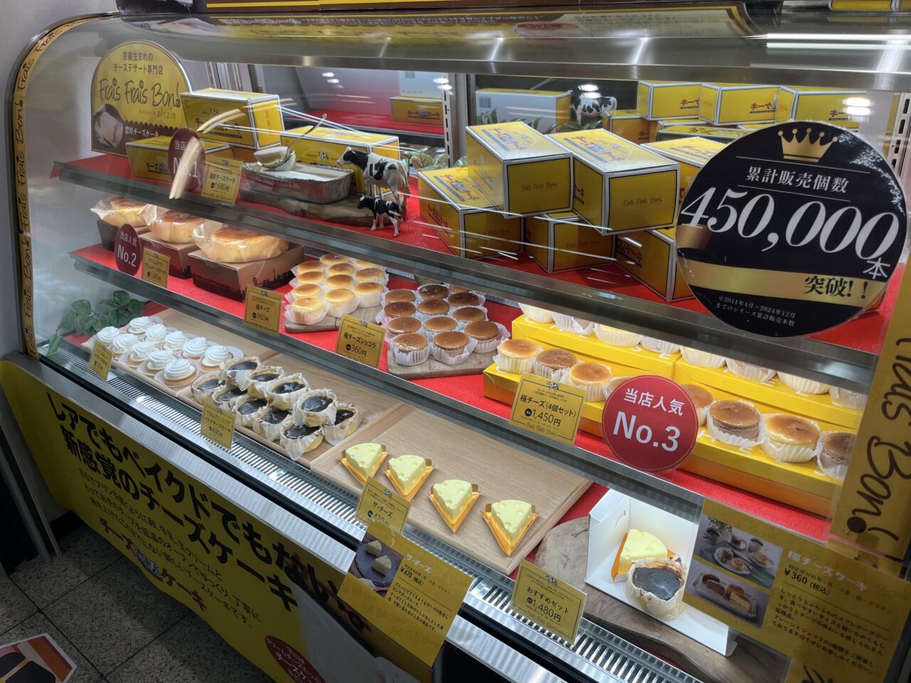 濃厚チーズケーキ、ブリュレチーズケーキ、極チーズ、ザ・チーズ、バスクチーズケーキ、レアチーズタルトなど様々なチーズケーキが販売されていました。