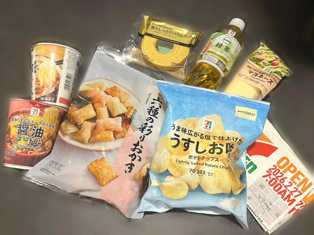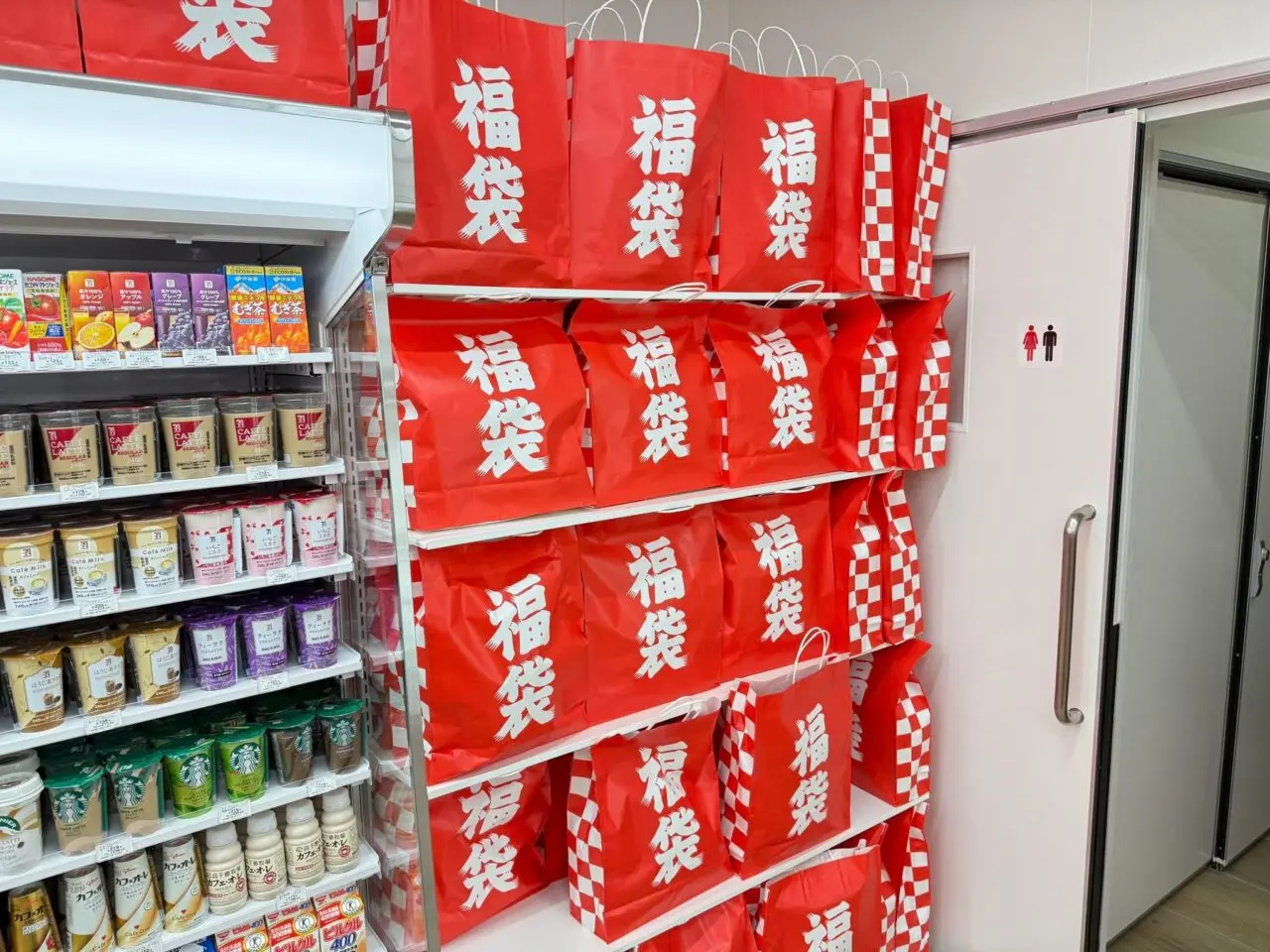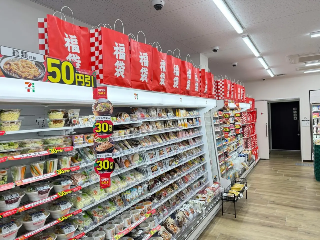 店内には、オープン記念の福袋や、おにぎり、セブン-イレブンオリジナルパン、麺類、サラダ類などの商品が30円〜50円引きで販売されていました(2026年3月1日まで)。