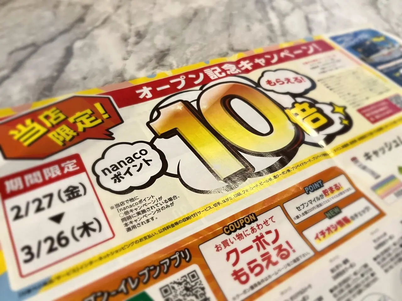 さらに『セブン-イレブン 東大阪岩田町4丁目店』限定で、nanacoポイントが10倍もらえるオープン記念キャンペーンが開催されています!※通常200円(税抜)につき1ポイントのところ、20円(税抜)で1ポイントが付与されます。
